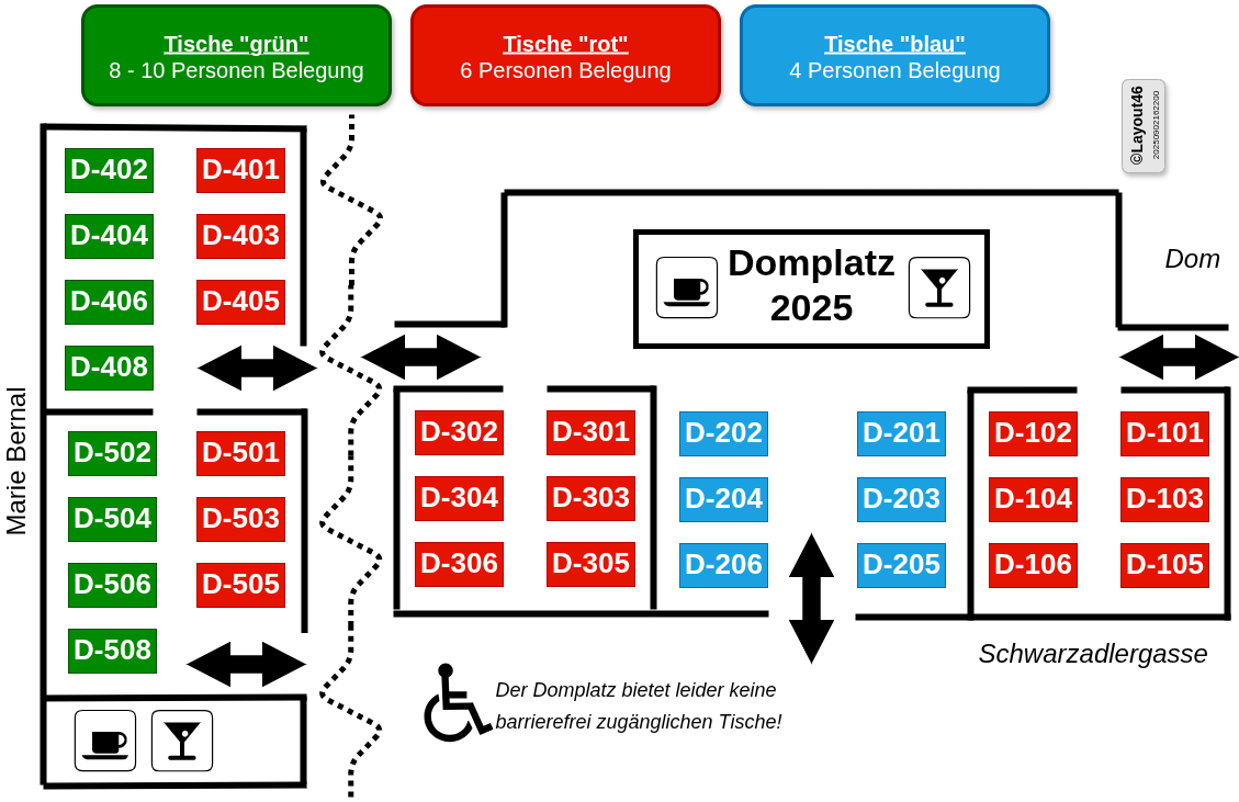 Tisch „rot“ Tischgruppe „D-1“(D-101 – D-106 für eine Belegung mit max. 6 Personen) -