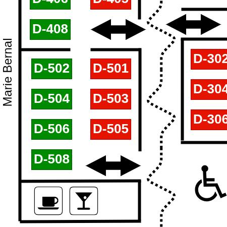 Reservierung für einen Tisch „rot“ Tischgruppe „D-5“ (D-501 – D-505 für eine Belegung mit max. 6 Personen)